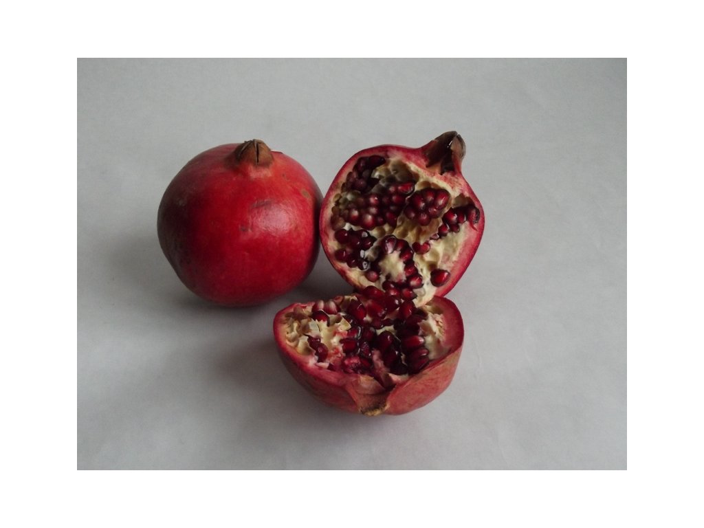 Granátové jablko pochází původně z malého ostrova Sokotra u pobřeží Somálska. Je až 12 cm velké, slupka je žluto oranžová až tmavě červená a je tvrdá a tlustá. Pod slupkou je šest až dvanáct pouzder, v nichž se ve sladkém červeném, bílém či růžovém rosolovitém míšku nachází četná semena. Celkový počet semen v jednom plodu zpravidla přesahuje 600. Chuť je sladko kyselá, jemně svíravá a semena jsou velmi aromatická. Čím je slupka tenčí, tím je jablko sladší. Sezóna je od září do února. Granátová jablka obsahují cca 77 % vody, velké množství sodíku a cukrů, dále vitamíny B a C. Jedlé části granátových jablek mohou působit projímavě.